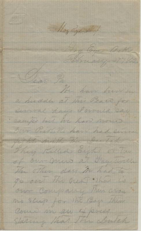 We have been in a huddle at this place for several days. I would say camps but we have none. Our picketts have had several fights with the Dutch. They killed eight or ten of our men at Fayetteville the other day. We had to go out the next, that is our company. Their [sic] is no sleep for the boys. Their (?) in an (?) press stating that the Dutch were falling back from Fayetteville. I am not able to say what we will be ordered to do follow. I guess Mr. Barkman & Kingsbury(?) arrived on yesterday. My blanket come in (?) (?). I will write again after the Battle. Their [sic] is no chance for the Dutch to get out of a fight. They have come to [sic] far. Tell Tom Ewing I will write him in a few days. The young men that are around Arkadelphia had better turn out or they will come to Clark. Write all news.