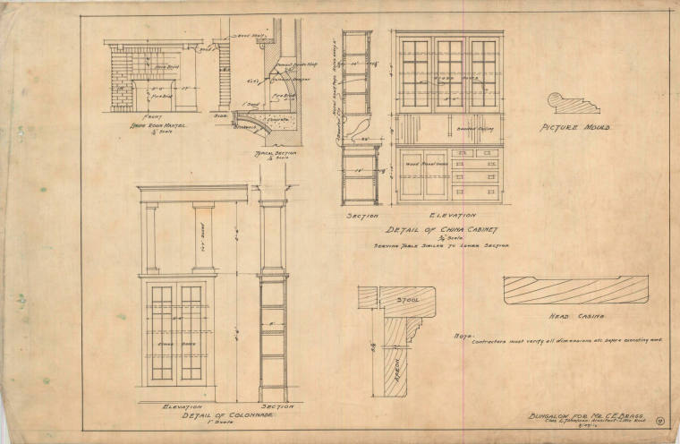 DescriptionCharles Thompson architectural drawing for C.E. Bragg in Alexander, Arkansas. China cabinets, colonnade, living room mantel, etc.Status