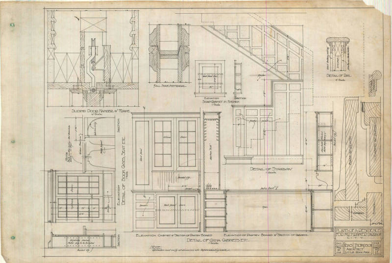DescriptionCharles Thompson architectural drawing for Kramer Darragh at 2412 Broadway in Little Rock, Arkansas. Stairs, bookcases, china cabinets, soap cabinet, etc.Status