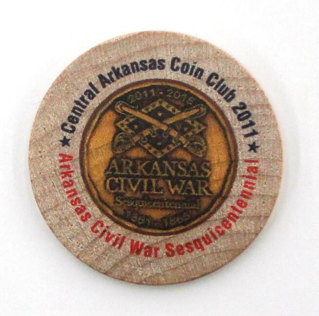 DescriptionCommemorative coin for the Arkansas Civil War Sesquicentennial. Obverse side reads: "Central Arkansas Coin Club 2011 in blue and "Arkansas Civil War Sesquicentennial" in red. In the center is an Arkansas Civil War logo in black and brown, featuring Confederate flag and crossed swords. Above the flag is printed: "2011-2015" Below the flag is printed: "Arkansas Civil War, Sesquicentennial, 1861-1865"