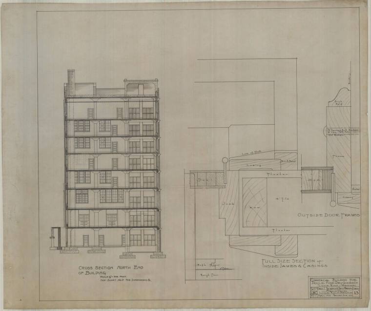 DescriptionCharles Thompson Architectural Drawing for Doyle Kidd Dry Goods in Little Rock, Arkansas. Full sized section of inside jambs and casings, cross section north end of building.Status