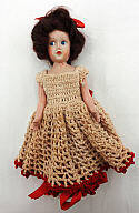 DescriptionStorybook doll. Short curly brown hair with red ribbon. White crocheted dress with red trim. She is also wearing white crocheted pants. Moveable arms and legs. White shoes. Blue, painted eyes.Status