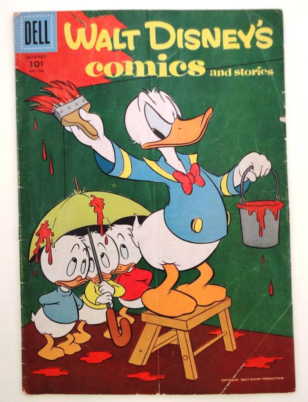 DescriptionA comic book entitled "Walt Disney's Comics and Stories". The book cover features an image of Donald Duck painting a green wall red, with Huey, Dewey, and Louie standing beneath an umbrella to avoid falling paint.Status