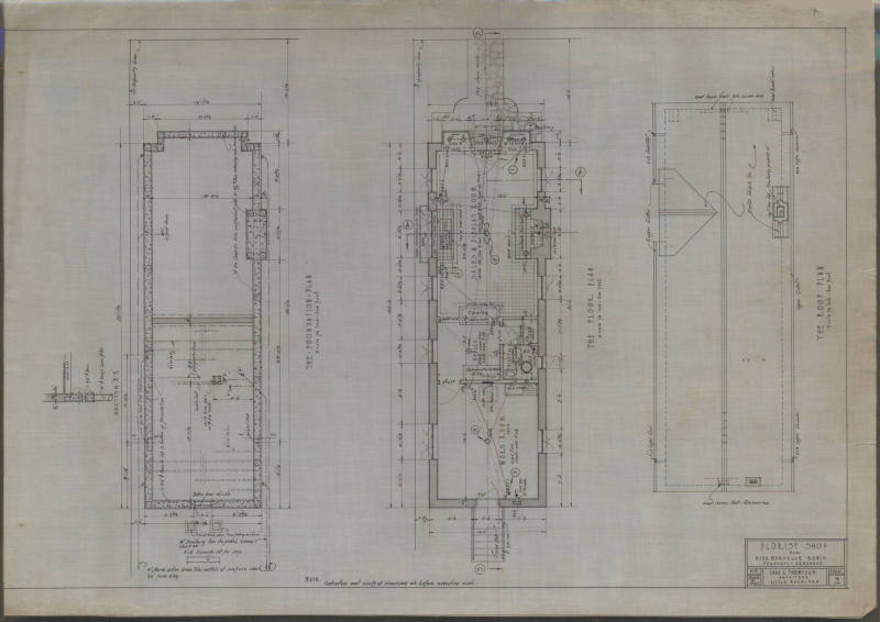 DescriptionCharles Thompson architectural drawing for a florist shop for Norvelle Bemis at 117 East 2nd Street in Prescott, Arkansas. Foundation plan, floor plan and roof plan.Status