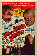 Poster from the movie "Abroad," starring Lum and Abner. The poster is red and white with red, white, and blue lettering. The poster shows cut-outs of Lum and Abner's heads on each side of the poster looking down at the title of the film. Images of a group of people watching a roulette wheel and women with blonde hair appear at the bottom--the image of the woman is larger than that of the crowd. "A big dish of corn with a continental flavor!" is printed at the top of the poster in white. Blue drawings of the Eiffel Tower and a depiction of a farm appear in blue in the background.