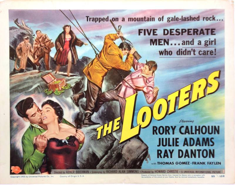Lobby card from the 1955 movie "The Looters," starring Rory Calhoun, Ray Danton, and Arkansas native Julie Adams (co-star Ray Danton was also Adams's second and current husband, having been married the year before). The card has a blue sky background with black and yellow print. The left side of the card shows two scenes from the movie. In the top left corner, the image is of a plane crash with Adams and two men behind her running towards a chest of money and Calhoun and Danton. The largest image, which is in the middle, shows Calhoun and Danton tied with ropes around the waist and fighting on the edge of a cliff. In the bottom left corner is Adams being held in a loving embrace by Calhoun. The title of the movie appears diagonally from the bottom left corner to the right in large yellow print. Above the title in the black print reads, "Trapped on a mountain of gale-lashed rock... / FIVE DESPERATE / MEN... and a girl / who didn't care!" The card is trimmed in white. The movie is about a rescue team sent out to find survivors of a plane crash and $250,000 in cash that was also on the plane.
