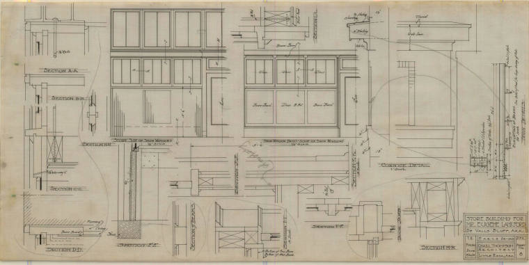 DescriptionCharles Thompson architectural drawing for Eugene Lankford in DeVall's Bluff, Arkansas. Show windows, cornice details, etc.Status