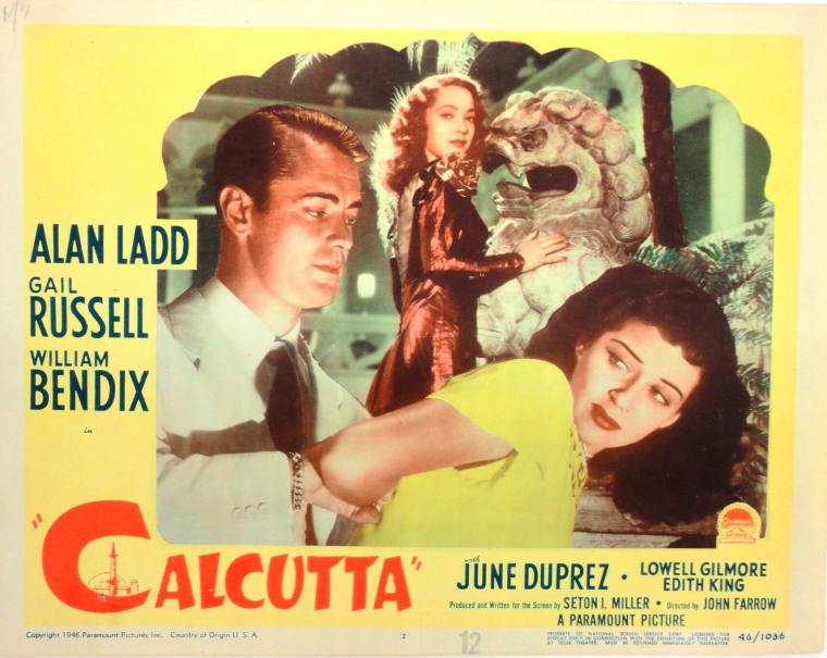 The card has a yellow background with red and black print and white trim. A color image from the movie shows Ladd and two women. Ladd is wearing a white suit and dark tie and is holding the arm of a woman behind her back. The woman has dark hair and is wearing a yellow dress. Standing behind them in the background is a woman in a red dress. The title of the movie is printed in red lettering in the bottom left corner.
