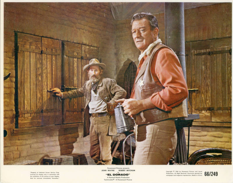 Color photographic publicity still from the movie "El Dorado," starring John Wayne and Arkansas native Arthur Hunnicutt. Black print at bottom. The image shows Hunnicut and Wayne in a cabin. Wayne is wearing an orange shirt and brown vest and holding a coffee can and cup. Hunnicut is in the background, leaning against closed wooden window shutters of the cabin. The movie was made by Paramount Pictures.