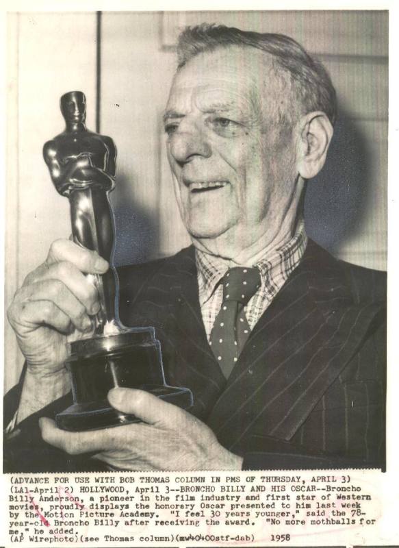 Black and white press photograph of Broncho Billy Anderson with his honorary Oscar in 1958. He is wearing a striped suit and a polka dot tie. A description is typed at bottom of photo: "(Advance for use with Bob Thomas Column in PMS of Thursday, April 3) (LA1-April 2) Hollywood, April 3--BRONCO BILLY AND HIS OSCAR--Broncho Billy Anderson, a pioneer in the film industry and first star of western movies, proudly displays the honorary Oscar presented to him last week by the Motion Picture Academy. 'I feel 30 years younger,' said the 78-year-old Broncho Billy after receiving the award. 'No more more mothballs for me,' he added." A news clipping taped to back reads: "Feels 'Younger' Broncho Billy Anderson, 78, the first star of Western movies, proudly displays the honorary Oscar presented last week and says, 'I feel 30 years younger.' Stamped Apr 4, 1958."