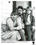 Oudoor porch scene with Duvall's arm around Harper and a boy leaning against him. Duvall is wearing a cap.