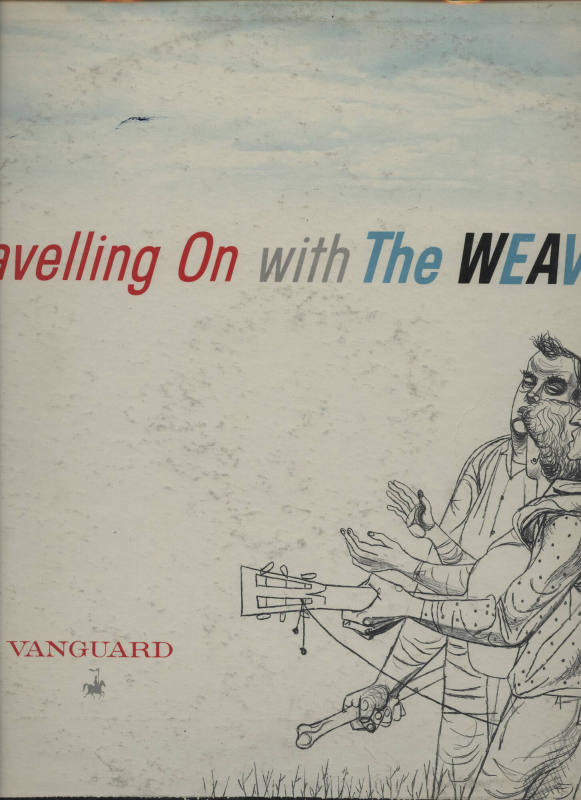 An album by The Weavers entitled "Travelling On with The Weavers". The album cover features an illustration of the band in the lower right corner. The title of the album is printed in red, gray, black, and blue text. "Travelling On with The Weavers" was produced by Vanguard Recording Society.