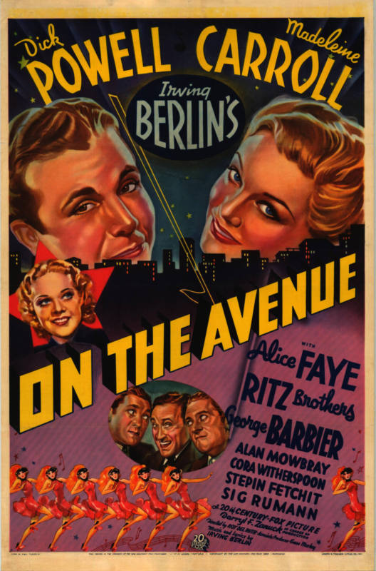 Poster from the movie, "On the Avenue" with Arkansas native, Dick Powell. Purple and blue background. Yellow, blue and white print. The poster shows the faces of some of the movie's actors.