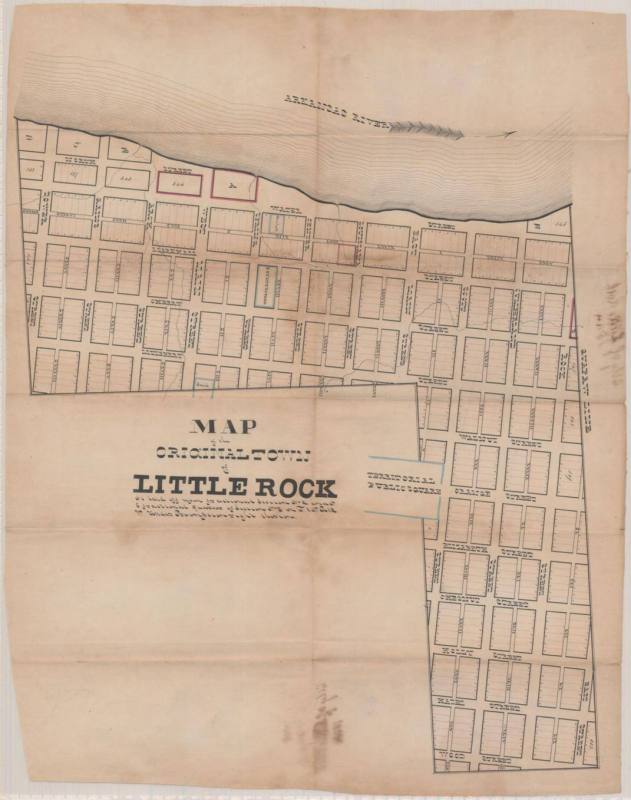 DescriptionThe map is hand drawn on linen with black ink. The map reads "map of the original town of Little Rock." The Arkansas River is at the top of the map it is indicated by a series of parallel blue lines. The northern-most street represented is North Street, which runs East to West. The Southern-most street represented is Wood Street, which runs east to west. The Western-most street represented is Tower Street which runs north to south. The eastern-most street represented is East Street. The eastern-most border of the map is labeled "Quapaw Line." Territorial Public Square" is blocked off in blue ink and lies south of Walnut Street and west of Scott Street. The "Jail" is also blocked off in blue ink and lies south of Mulberry Street and east of West Main Street. "Market" is blocked off in blue ink and lies between Spring and Center streets and South of Water street. The "County Square" lies between Spring and center streets and between Markham and Cherry streets, On the back of the map, "City of Little 1844" is written. Twelve streets running east to west are represented. Eleven streets running north to south are represented.