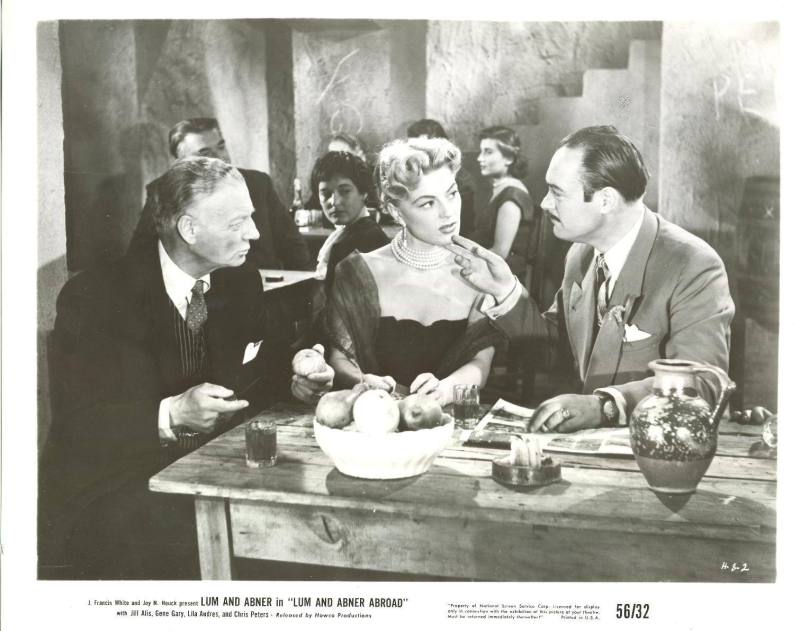 Black and white photograph from the movie, "Lum and Abner Abroad" starring Arkansas natives, Lum and Abner. Two men and a woman sit at a rough wooden table. On the table is a pitcher, a bowl of fruit, a couple of glasses and newspaper. The woman seated at the table is a blonde and she is wearing a dark colored dress. Both men are wearing suits. There are people at other tables in the background. Black print beneath the photograph.