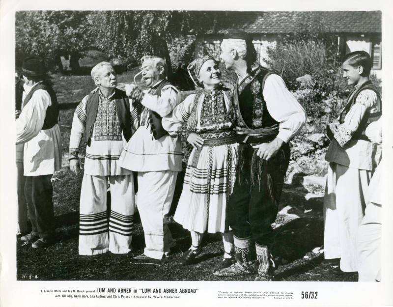 DescriptionBlack and white photograph from the movie, "Lum and Abner Abroad," starring Arkansas natives Chester Lauck and Norris Goff as Lum and Abner. Chester Lauck (known as Columbus Edwards "Lum" Eddards) and Norris Goff (known as Abner Peabody) both grew up in Arkansas and attended the University of Arkansas in Fayetteville, Arkansas. They created the radio show Lum and Abner, which was set in the fictional town of Pine Ridge, Arkansas, in 1931. It aired until 1954, producing nearly 5,000 episodes during its 24-year run. The show was modeled on life in Waters, Arkansas. In fact, Waters eventually changed its name to Pine Ridge in 1936 because of the show. The radio show spawned several films from 1940-1956, including "Dreaming Out Loud," "The Bashful Bachelor," "Two Weeks to Live," 'So This is Washington," "Goin' to Town," "Partners in Time," and "Lum and Abner Abroad."