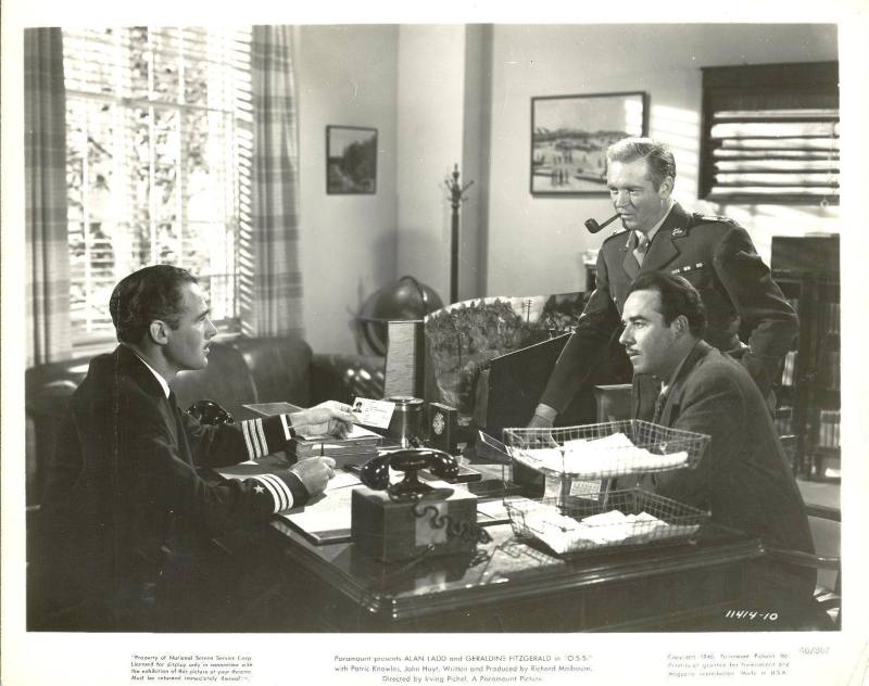 Black and white movie still photograph from the movie, "O.S.S." starring Arkansas native, Alan Ladd. Mr. Ladd is not featured in the photograph. Office scene. One man in a military uniform sits behind a desk. Two men in uniform are in front of the desk - one sitting and one standing. The man standing is smoking a pipe.