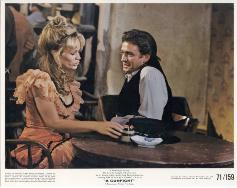 DescriptionBlack and white photograph of a scene from the movie, A Gunfight, starring Arkansas native, Johnny Cash. An image of Cash with a woman seated at a table. Cash is in profile. He is wearing a light colored shirt and a dark colored vest. The woman is wearing a peach colored dress.Johnny Cash was born February 26, 1932 in Kingsland, Arkansas and raised in Dyess, Arkansas. Nicknamed “The Man in Black”, he was a singer/songwriter, actor and author (writing two autobiographies). He acted in both movies and television (including his own variety show, The Johnny Cash Show). Cash died September 12, 2003.