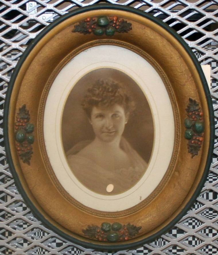 DescriptionOval photograph of Bessie Davis, daughter of Governor Jeff and Ina Davis. She is wearing a light colored dress and pearl earrings. She is posed slightly to the right, with her head facing the camera. Framed with gold painted frame with black bainted edge. Frame has embossed decorations of leaves and chestnuts.