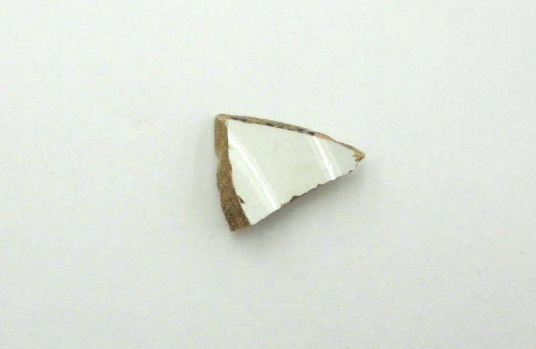 DescriptionSmall piece of white ceramic found on the grounds of the Old State House in 1979. Reference number: 79-675-35. Site number: 3H096. Triangular shape.Status