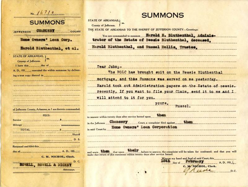 A typewritten letter on summons "Dear John, The HOLC has brought suit on the Bessie Blumenthal mortgage and this summons was served on me yesterday. Harold took out administrative papers on the Estate of Bessie recently. If you want to file your claim, send it to me and I will attend to it for you. Yours, Russel." (Hollis)