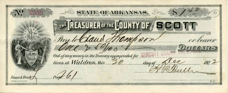 DescriptionArkansas scrip from Scott County. $1.50 Note. Rothert number is unlisted. Serial number is 2559. From the town of Waldron. Rarity level is 5. Printed by Democrat P.&L. in Little Rock. Used to pay for circuit court expenses. It was recorded in Record Book L, page 261. Made out to Claud ThompsonStatus