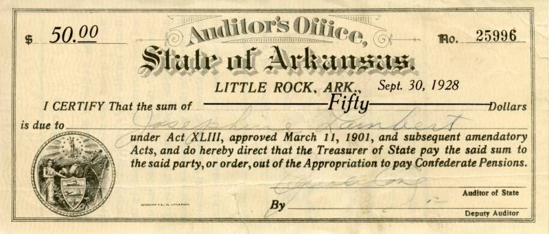 DescriptionScrip from the Arkansas State Auditor's Office, $50 note. Rothert number is unlisted. Serial number is 25996. Rarity level is 10. Printed by Democrat P&L Co. in Little Rock. Preprinted with spaces for signatures and endorsee name. Date and amount printed later. Funds payable out of appropriation to pay Confederate pensions. Endorsement instructions on reverse. This auditor's warrant hasn't been seen before. Never cashed. Discovery note.Status