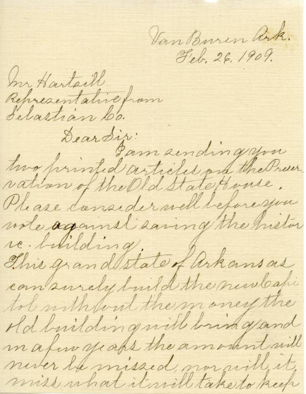 DescriptionTwo page letter written to Mr. Hartsill by Clara B. Eno about the preservation of the Old State House. Hartsill was a representative from Sebastian Co.Van Buren, Ark.