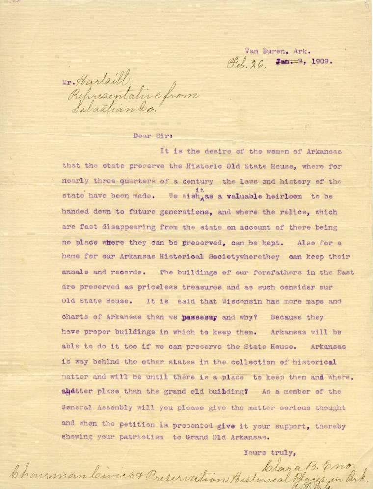 It is the desire of the women of Arkansas that the state preserve the historic Old State House, where for nearly three quarters of a century the laws and history of the state have been made. We wish it as a valuable heirloom to be handed down to future generations and where the relics, which are fast disappearing from the state on account of there being no place where they can be preserved, can be kept. Also for a home for our Arkansas Historical Society where they can keep their annals and records. The buildings of our forefathers in the East are preserved as priceless treasures and as such consider our Old State House. It is said that Wisconsin has more maps and carts of Arkansas than we and why? Because they have proper buildings in which to keep them. Arkansas will be able to do it too if we can preserve the State House. Arkansas is way behind the other states in the collection of historical matter and will be until there is a place to keep them and where better a place than the grand old building? As a member of the General Assembly will you please give the matter serious thought and when the petition is presented give it your support, thereby showing your patriotism to Grand Old Arkansas.