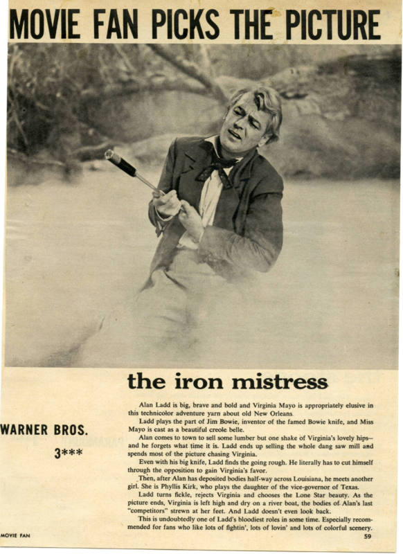 Black and white ad from the magazine, "Movie Fan" for the movie, "The Iron Mistress" starring Arkansas native, Alan Ladd. At the top of the page in bold black print: "Movie Fan Picks the Picture". Beneath is an image of Ladd in the movie. Part of scrapbook kept by the president of Ladd's fan club.