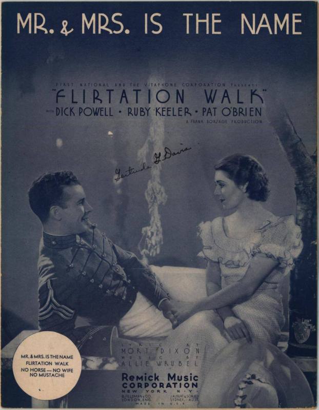 A booklet of sheet music from "Flirtation Walk", a film starring Arkansas native Dick Powell. The cover features a blue and white photograph of Powell in military attire and his costar, Ruby Keeler. The sheet music is for "Mr. & Mrs. Is The Name". "Flirtation Walk" was produced by First National and The Vitaphone Corporation in 1934.