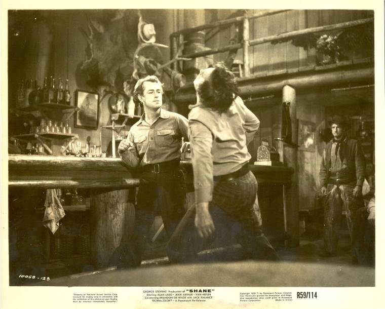 The black and white image features Ladd involved in a bar fight with an unidentified co-star. A Hot Springs native, Ladd played the title role in the film, which was nominated for five Acadmey Awards. The film was selected for preservation by the National Film Registry in 1993. The film was produced by Paramount Pictures Corporation in 1953.