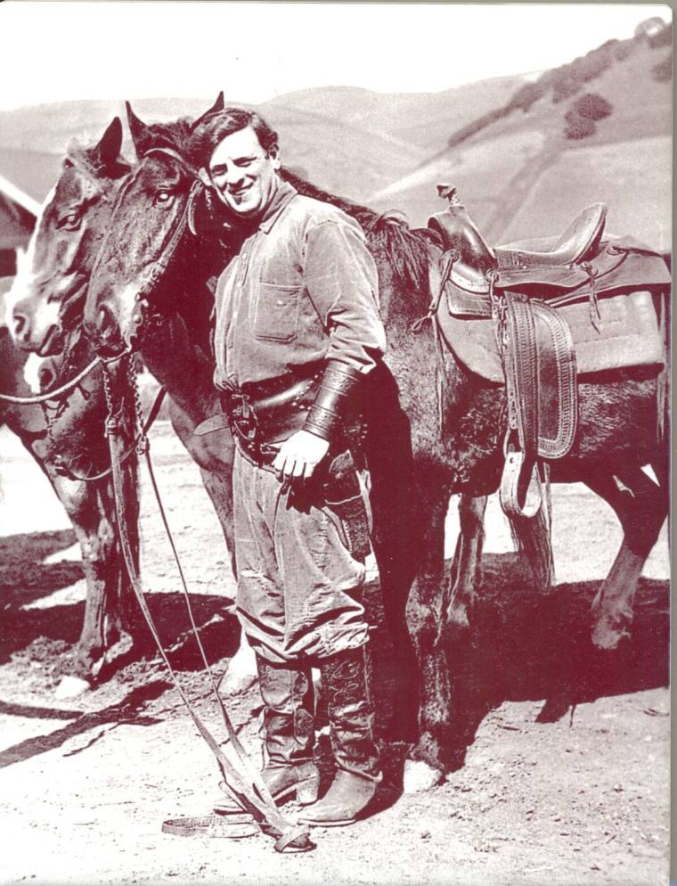 A polymer coated ceramic tile displaying an image of Broncho Billy Anderson. The black and white image features Anderson dressed in western wear and standing alongside two horses. A label adhered to the back states "G.M. "Broncho Billy" Anderson c. 1912 in the Niles Hills". The tile is the 10th out of 100 tiles produced of it's kind.