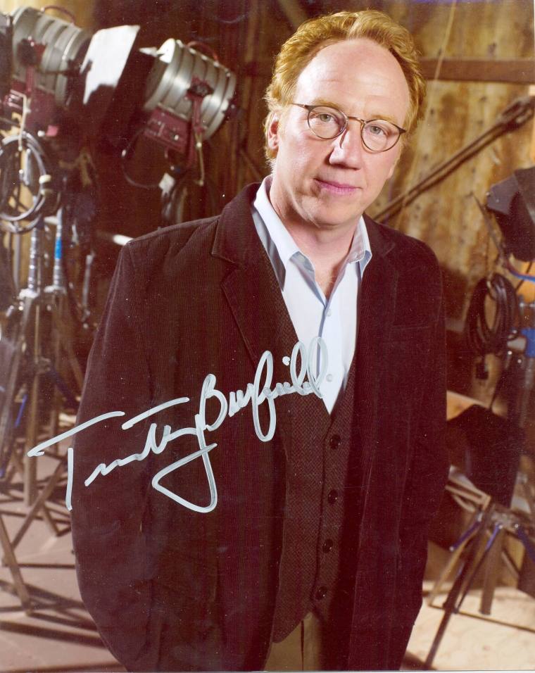 The photograph features Timothy Busfield wearing a jacket, vest, collared shirt, and glasses set upon a background of production equipment. The photograph is autographed "Timothy Busfield" in silver ink.