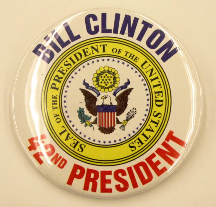 DescriptionButton prominently featuring the Presidential Seal with "Bill Clinton" in blue text across the top and "42nd President" in red text across the bottom. The seal and text are set against a white background.The button is round and 3 inches in diameter.