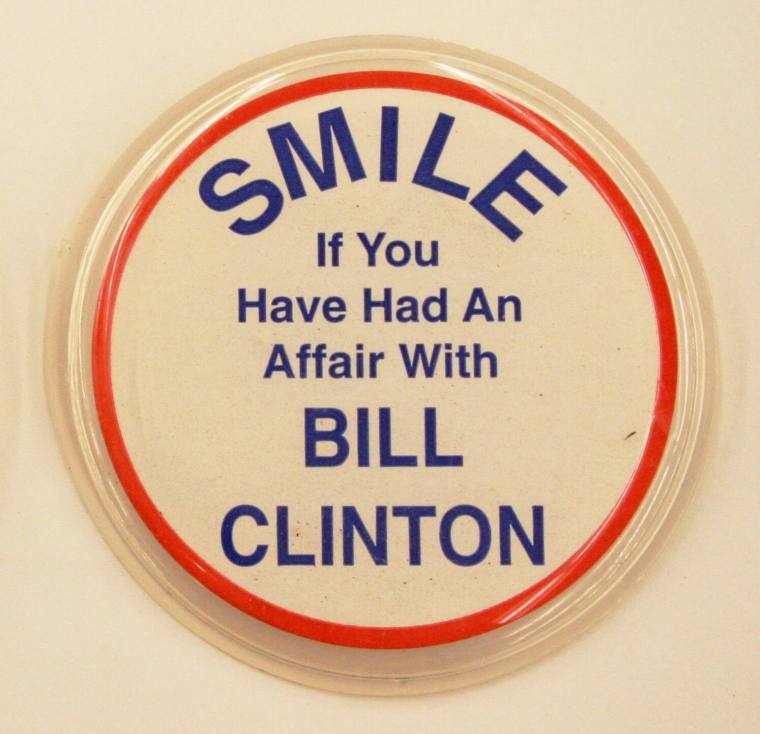 DescriptionButton featuring the text "Smile if you have had affair with Bill Clinton" in blue text against a white background with a red ring around the outside.The button is 3 inches in diamter and is made of plastic.
