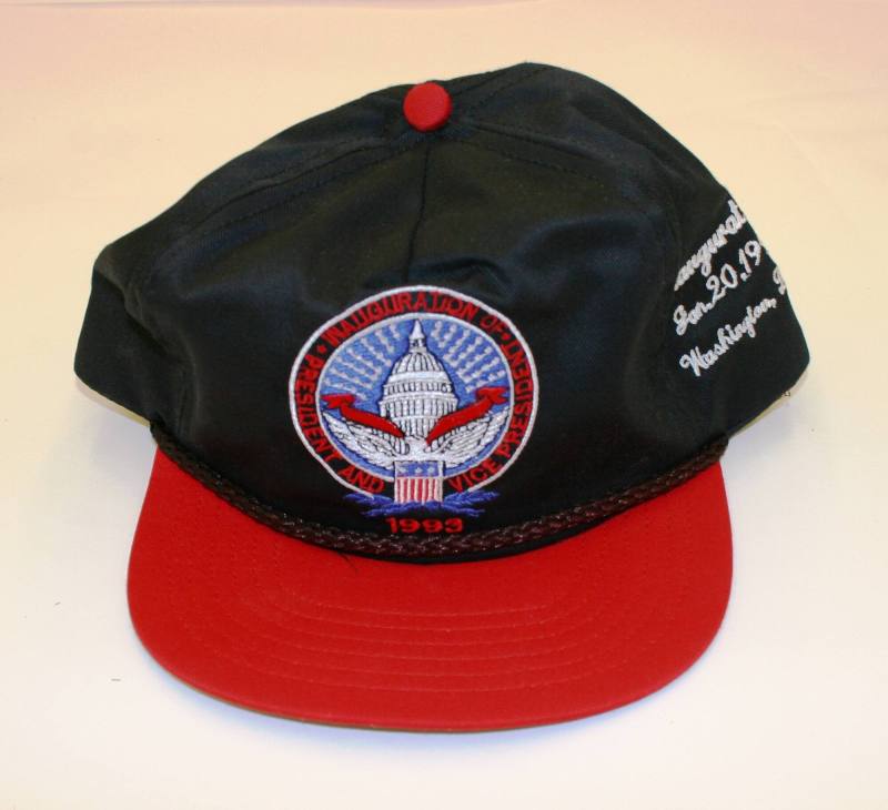 DescriptionBaseball style cap, black with red bill. A logo of the state capitol against a blue background is on the front. In red "Inauguration of President and Vice President 1993." On the side in white thread is "Inauguration Jan. 10, 1993 Washington D.C." The cap commemorates the inauguration of President Bill Clinton and Vice President Al Gore.
