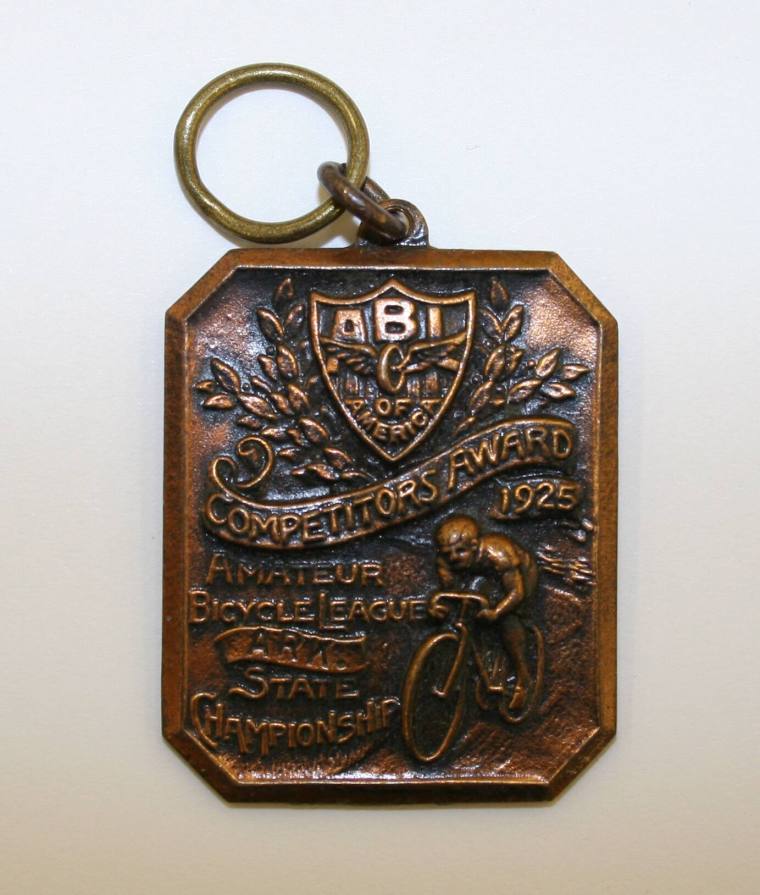 DescriptionAn Amateur Bicycle League of America Competitors Award for the 1925 Arkansas State Championship. The Amateur Bicycle League of America is now known as the United States Cycling Federation, or, USA Cycling. The medal is bronze and features a relief depicting a person riding a bicycle as well as the Amateur Bicycle League of America shield, a banner, and decorative laurel leaves.Status