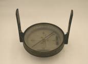 The compass is made of brass, glass, liquid, and metal. The compass is composed of a circular brass box containing a magnetic needle, which is designed to move freely around the circle that has been divided into 360 degrees. The needle and a brass bar are protected by a glass covering, and a pair of collapsible sights is located at the North-South axis of the compass. Compasses were typically mounted on tripods or staffs and rotated on a ball and socket joint. The Surveyor’s Compass is an instrument used to measure horizontal angles and for determining the magnetic bearing of a line sight. Surveyors would use this type of compass to help determine land lines, property boundaries, and other information useful to mapmaking, construction, and engineering.