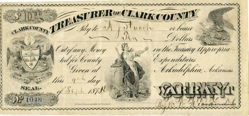 DescriptionA piece of scrip from Clark County, Arkansas worth ten dollars. The note was written to A.J. Stuart and issued by the county clerk in Arkadelphia on September 9, 1874. It was printed by St. Louis Democrat Litho and Print CO.The scrip reads: "$10.00" / "Clark County." "Treasurer of Cark County." / "Pay to A.J. Stuart or bearer / Ten Dollars." / "Out of any money in the Treasury appropria- / ted for County Expenditures," "Given at Arkadelphia, Arkansas, / " this 9th day / of Sept 1874." / "No. 1048." / "County Warrant."