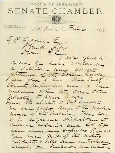 H.I. Falconer served as sheriff of Sebastian County from 1874-1884; this warrant addresses the requisition of suspected murderer William Henley (or Henly). The secretary of state's office was at the Old State House from 1836 - 1911.