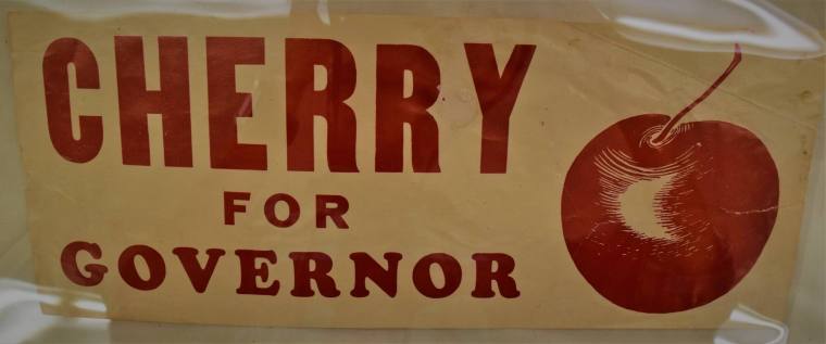 DescriptionA bumper sticker campaigning for Governor Francis Cherry. The background of the sticker is white with the words "Cherry For Governor" portrayed on the right hand side. On the left side of the bumper sticker is a very large cherry, which Governor cherry used prominently throughout his campaign trail for Governor.Status