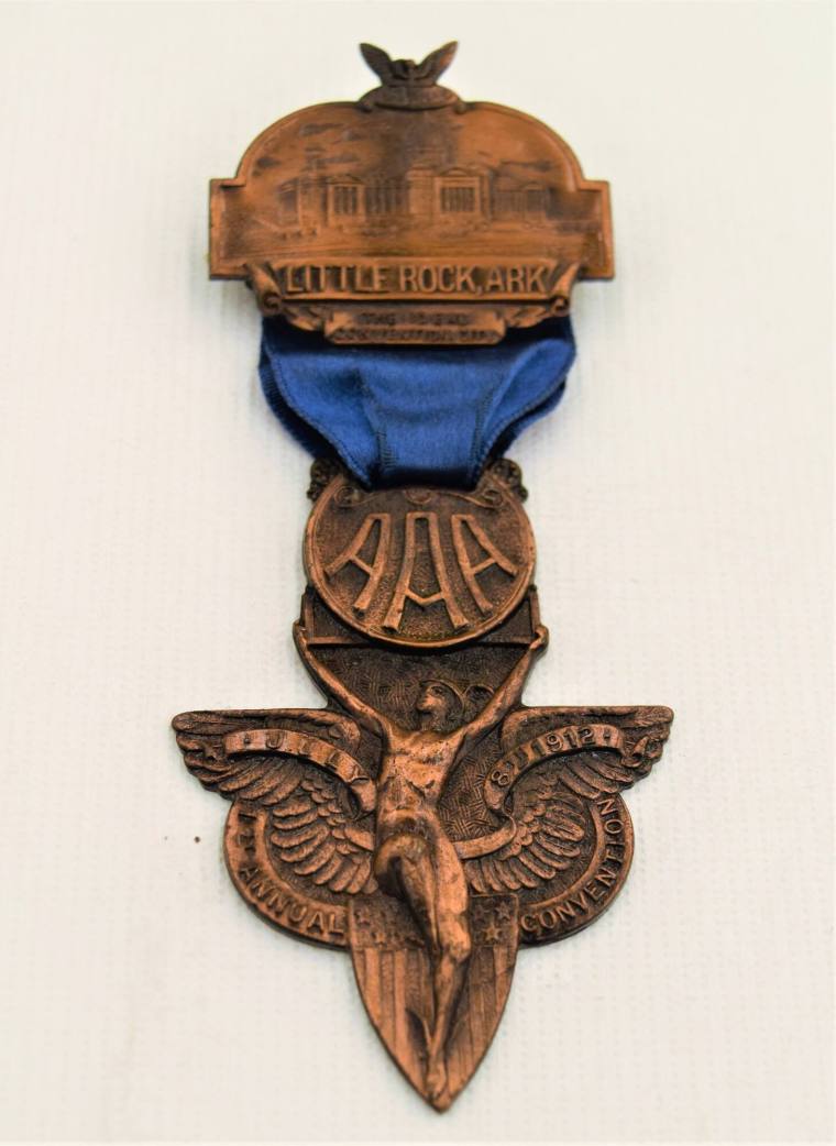DescriptionThe blue ribbon has a metal pin at top with an etching of the Little Rock, Arkansas State Capital building with a banner of the location underneath, with the motto "The Ideal Convention City." Attached to the bottom of the ribbon is a medal is a man with wings holding an triple A emblem. The date July 8, 1912 and 1st Annual Convention is pressed into the the medal.Status