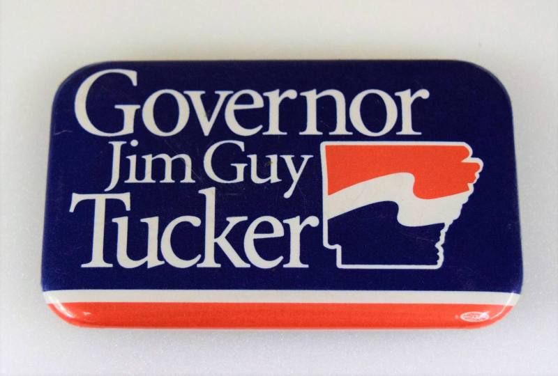 DescriptionA campaign button for Governor Jim Guy Tucker. The pin is rectangle in shape and has a dark blue background with a thin white and red stripe on the button. There is an outline of the state of Arkansas with red, white, and blue wave stripes going through.Status
