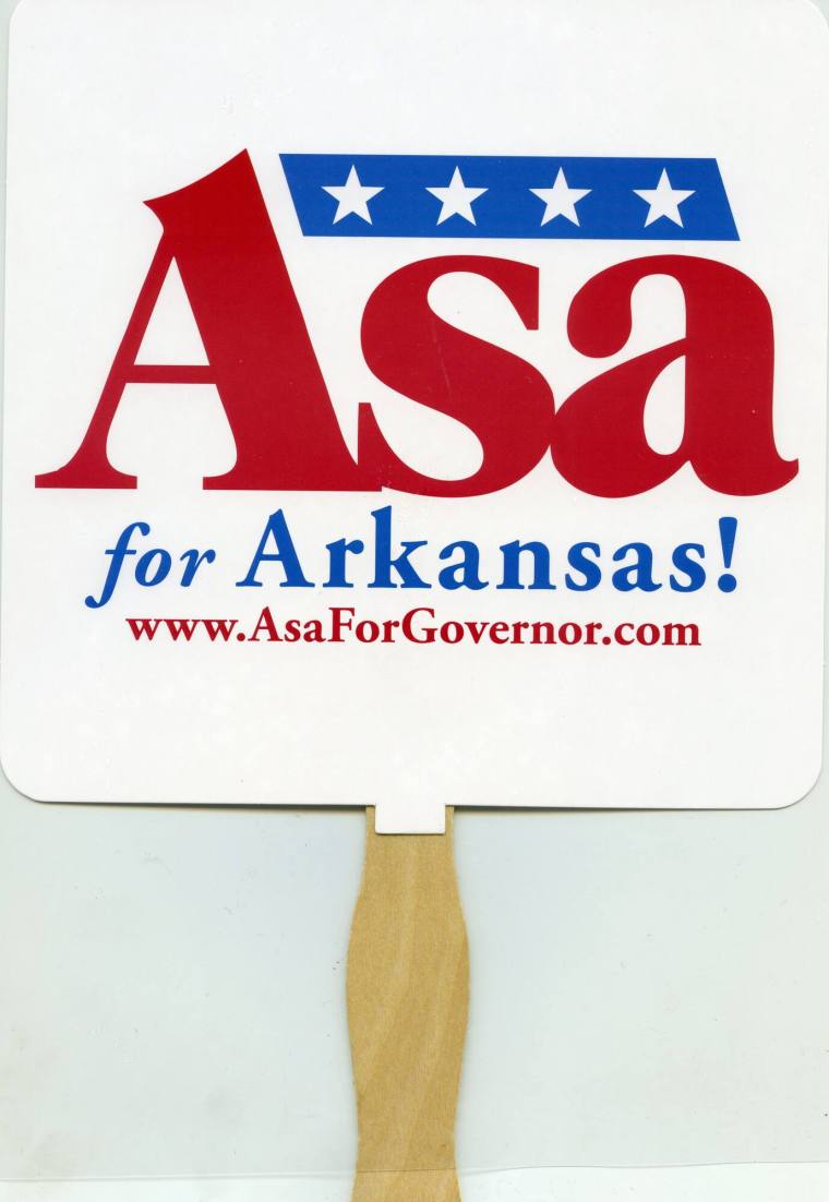 DescriptionWhite paper fan with the "Asa for Arkansas!" logo in the center. The logo features a blue parallelogram with 4 white stars along with the words "Asa for Arkansas!" written in red and blue lettering. "www.AsaForGovernor.com" is written in red underneath the logo.Status