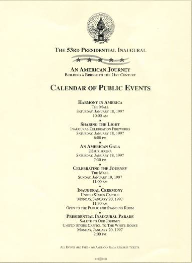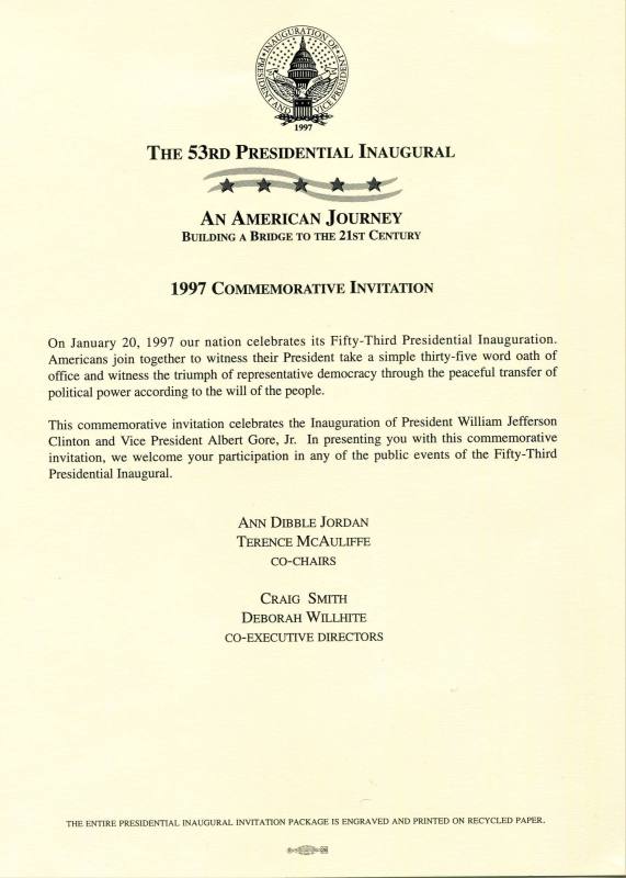 DescriptionA 1997 commerorative invitation for the 53rd Presidential Inaugural events for President Bill Clinton, and Vice President Al Gore.Status