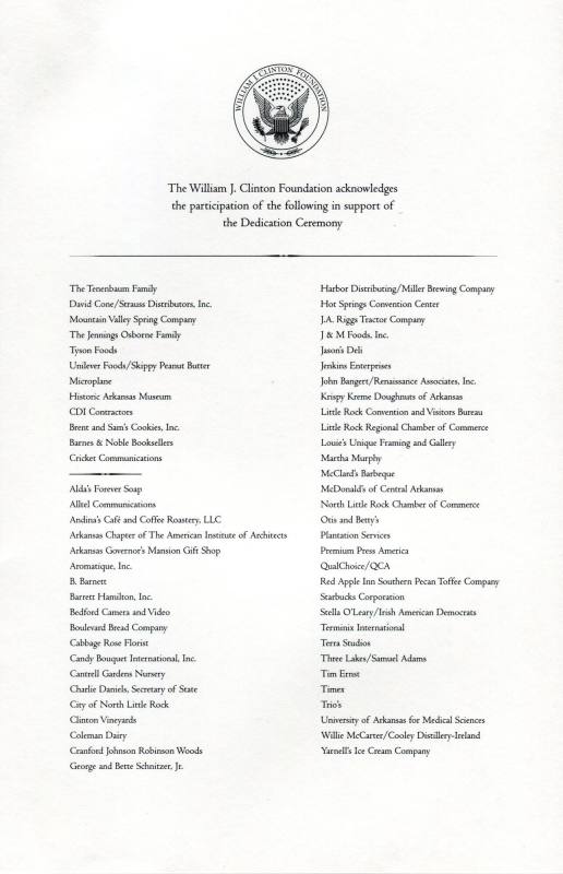 DescriptionA note from the William J. Clinton Foundation acknowledging the support and participation of those listed in the Dedication Ceremony of the William J. Clinton Presidential Center (see below for list). This note was found inside the Dedication Ceremony program (see 2019.009.56.1).The following were listed in the acknowledgement: The Tenenbaum Family, David Cone/Strauss Distributors, Inc., Mountain Valley Spring Company, The Jennings Osborne Family, Tyson Foods, Unilever Foods/Skippy Peanut Butter, Microplane, Historic Arkansas Museum, CDI Contractors, Brent and Sam’s Cookies, Inc., Barnes & Noble Booksellers, Cricket Communications, Alda’s Forever Soap, Alltel Communications, Andina’s Café and Coffee Roastery, LLC, Arkansas Chapter of the American Institute of Architects, Arkansas Governor’s Mansion Gift Shop, Aromatique, Inc., B. Barnett, Barrett Hamilton, Inc., Bedford Camera and Video, Boulevard Bread Company, Cabbage Rose Florist, Candy Bouquet International, Inc., Cantrell Gardens Nursey, Charlie Daniels, Secretary of State, City of North Little Rock, Clinton Vineyards, Coleman Dairy, Cranford Johnson Robinson Woods, George and Bette Schnitzer, Jr., Harbor Distributing/Miller Brewing Company, Hot Springs Convention Center, J.A. Riggs Tractor Company, J & M Foods, Inc., Jason’s Deli, Jenkins Enterprises, John Bangert/Renaissance Associates, Inc., Krispy Kreme Doughnuts of Arkansas, Little Rock Convention and Visitors Bureau, Little Rock Regional Chamber of Commerce, Otis and Betty’s, Plantation Services, Premium Press America, QualChoice/QCA, Red Apple Inn Southern Pecan Toffee Company, Starbucks Corporation, Stella O’Leary/Irish American Democrats, Terminix International, Terra Studios, Three Lakes/Samuel Adams, Tim Ernst, Timex, Trio’s, University of Arkansas for Medical Sciences, Willie McCarter/Cooley Distillery-Ireland, Yarnell’s Ice Cream Company.