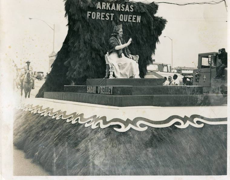 DescriptionA black and white photo of Sarah O'Kelley waving, riding on a parade float as the Arkansas Forest Queen in the1963 Arkansas State Fair parade.Status