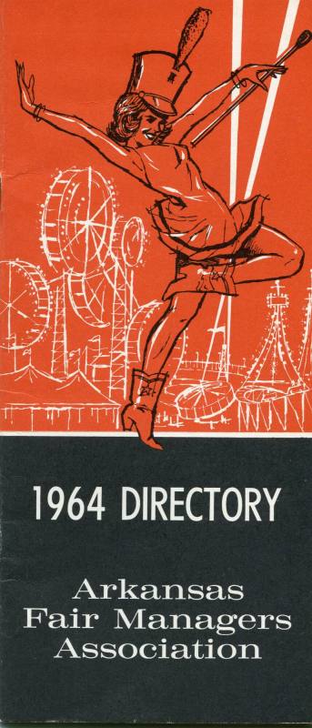 DescriptionA 1964 directory for the Arkansas Fair Managers Association. The cover features a baton twirler in front of a silhouetted carnival. Printed in rich red and black inks on white/ off-white cardstock. Inside is yellow paper with black ink. Directory is stapled in the center fold.Verso: "Let's Go To The Fair; All This Is A Fair"