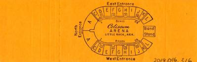 DescriptionAn orange rodeo reserved seat ticket with black and red lettering for the bandstand from the Arkansas Livestock Exposition held on Thursday October 7, 1965, 8:00 P.M. Seating location is Row 2, Seat 15. Ticket is perforated on the right side and was printed by Weldon, Williams, & Lick, Ft. Smith, Arkansas. TheVerso: Entrance map for Barton Coliseum printed in black ink.